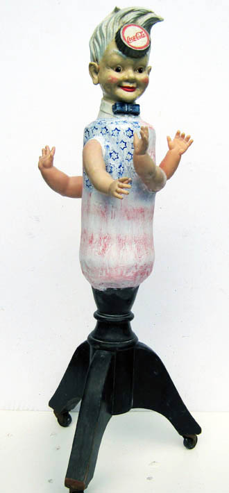 Old metal Coke money box on constructed body with doll arms..