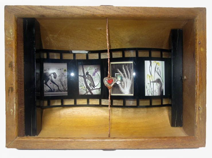 glass heart in copper cage, with X-ray images in curved glass frame