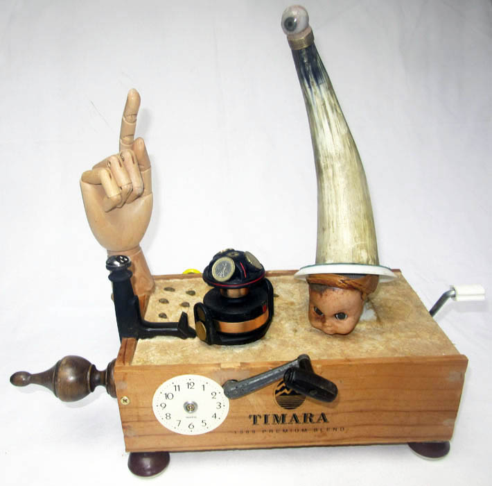 The handle which turns the money tree (my brother's fishing reel) also drives a music box.