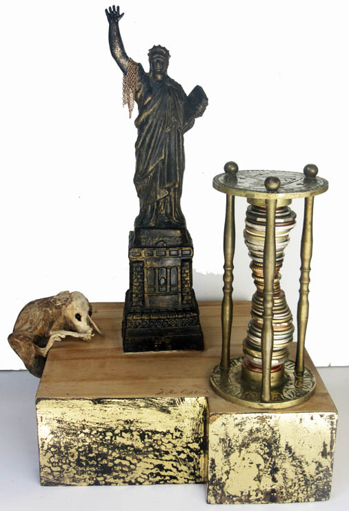 Statue of Liberty with modified hand, fossil rat, tottering column of coins