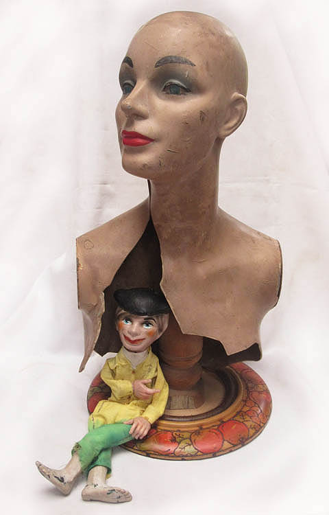 A broken and battered mannequin, and a little puppet.