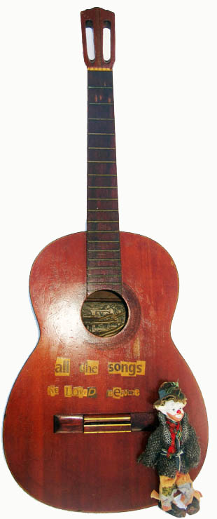An old and battered guitar, a gift from John Ellis: scratched, gouged, stringless, with the words made of cut-out letters.
