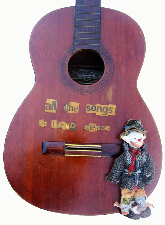 An old and battered guitar: scratched, gouged, stringless, with the words made of cut-out letters.