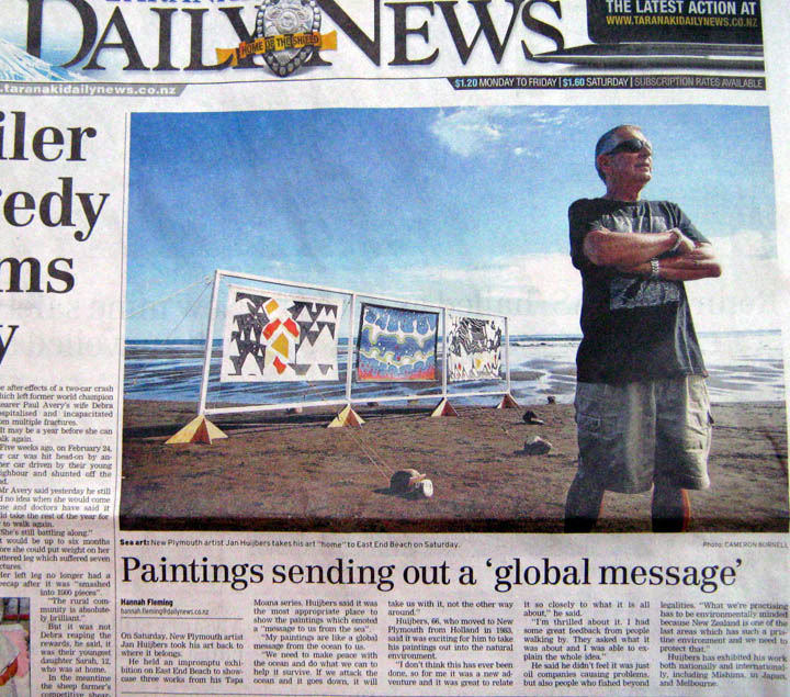 East End beach New Plymouth NZ, April-2012: News media "Global Message".
