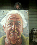 artist (and dog) with painting.