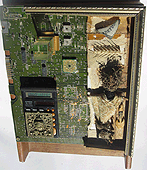found materials: old circuit board, light-operated calculator, old brass religious object